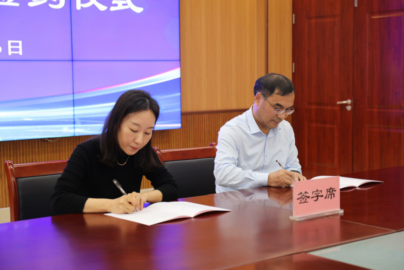 山东师范大学外国语学院副院长张媛(左)与济南市长清中学校长刘兴武(右)共同签订聘书协议和实习基地协议。