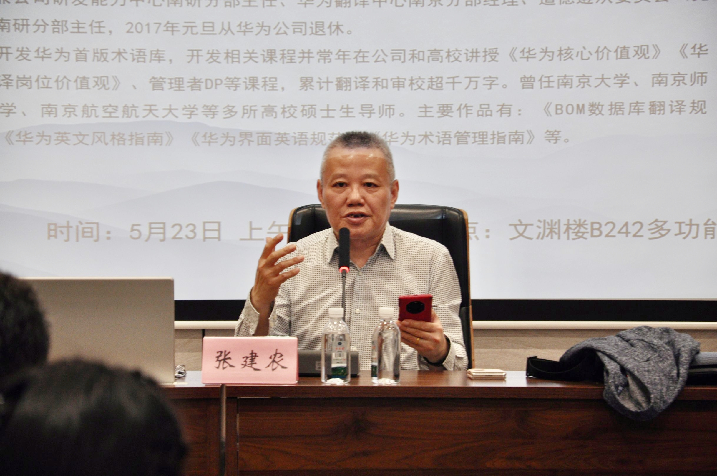 2023年5月23日上午,外国语学院于长清湖校区文渊楼B区242举办“翻译技术、翻译教学和翻译人才培养——以华为翻译和本地化业务为例”主题的讲座。讲座由原华为技术有限公司工程师、首席笔译兼公司研发能力中心南研分部主任、华为翻译中心南京分部经理张建农部长主讲,外国语学院教授徐彬主持,部分本科生和研究生参加了讲座。