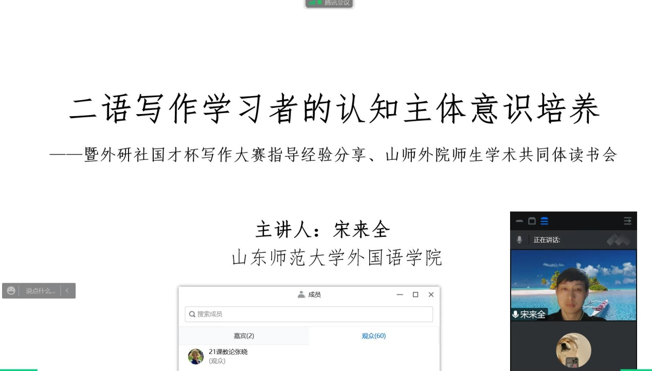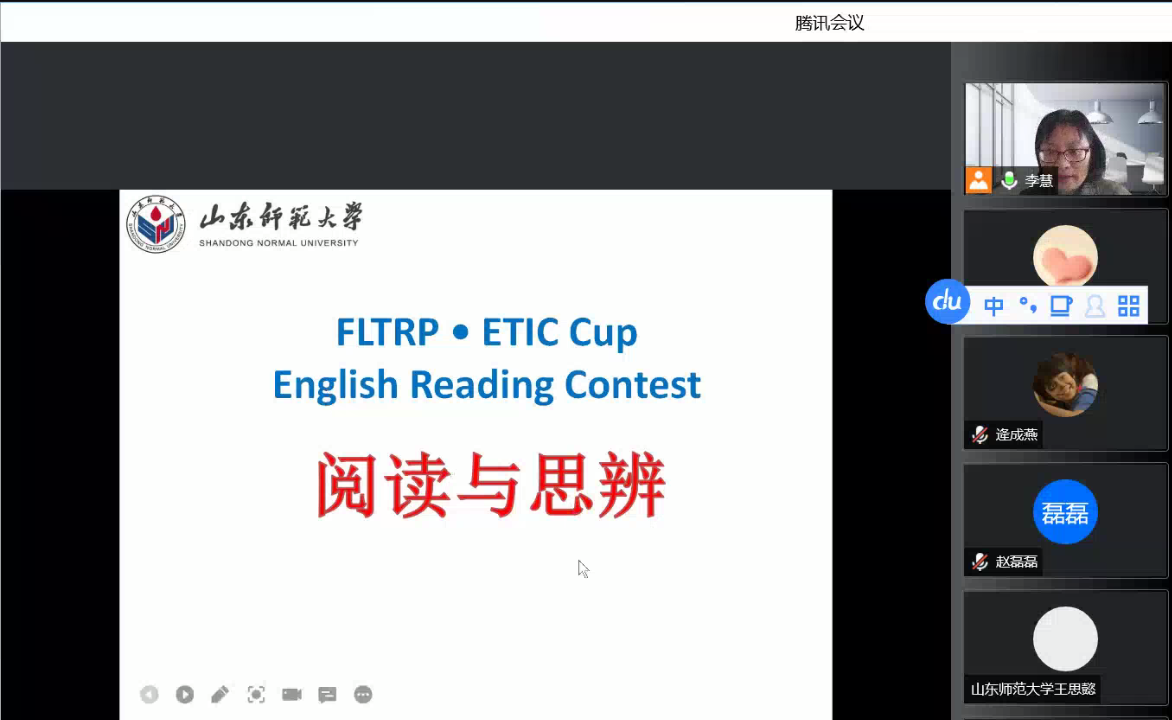 为提高学生的外语能力、沟通能力与思辨能力,培养具有国际视野、创新意识、家国情怀、未来精神的国际化人才,引导大学生坚定文化自信、提升综合素养,推动话语表达与时代精神同向共进,从而达到以赛促学、以赛促教的目标,4月21日至4月23日,由山东师范大学教务处、山东师范大学外国语学院、山东师范大学英语竞赛中心联合主办的“外研社•国才杯”三赛公益讲座在腾讯会议举行,竞赛中心三位指导教师——王秀香老师、宋来全老师、李慧老师分别进行了专题讲座,并在讲座最后与同学们进行积极互动,吸引了校内各院系同学的热情参与。