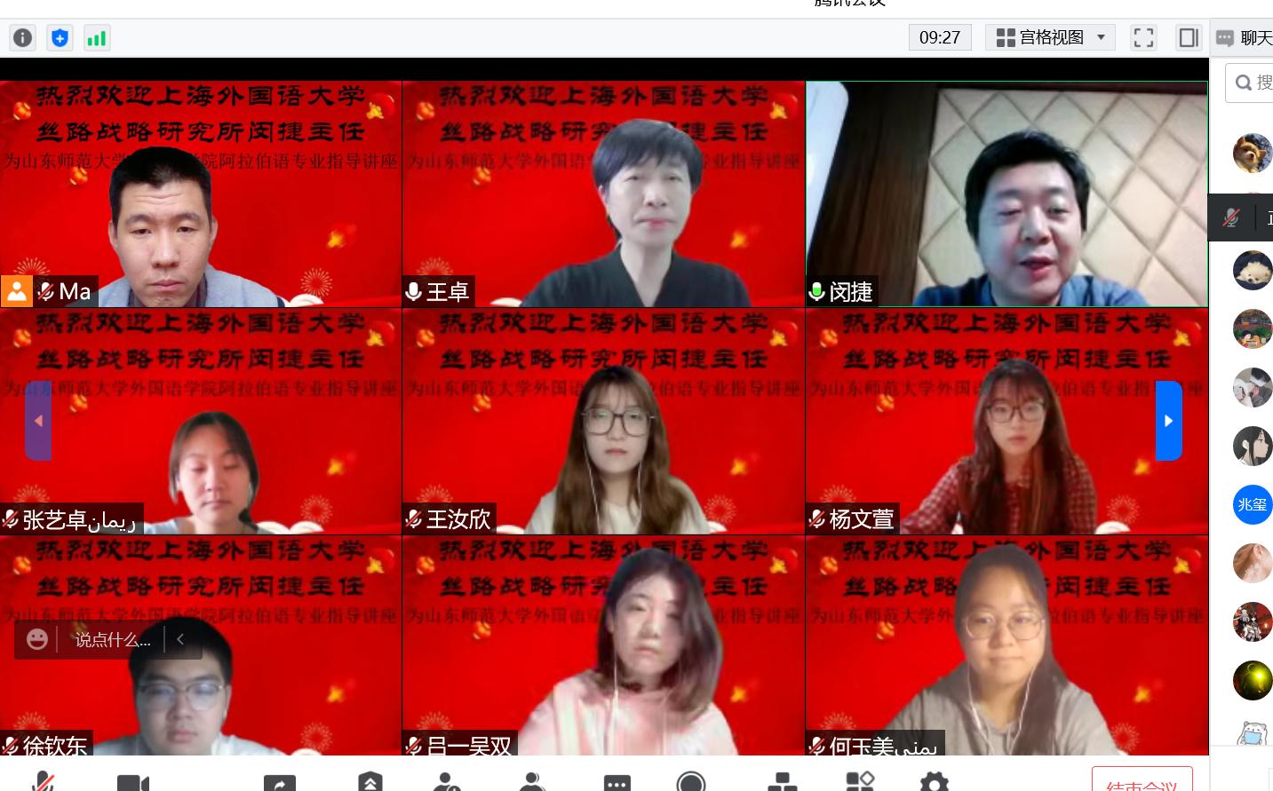 为普及丝路历史,传播丝路文化,4月23日下午,山东师范大学外国语学院邀请到了上海外国语大学丝路战略研究所硕士生导师闵捷教授主讲“在中国与世界间的丝路研究”线上讲座。外国语学院院长、博士生导师王卓教授,阿拉伯语专业负责人马保全老师,部分专业教师、阿拉伯语专业20级及21级全体学生和部分毕业生代表出席了本次讲座。