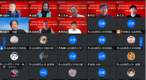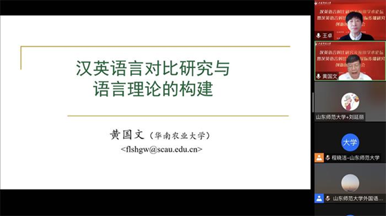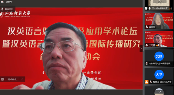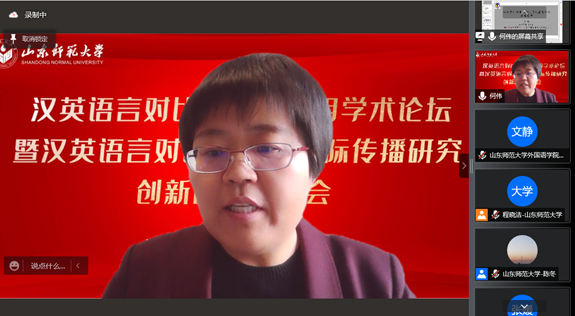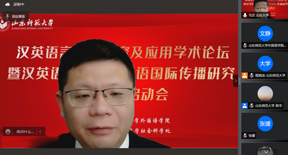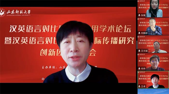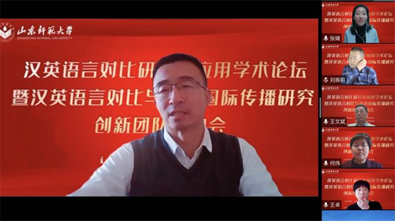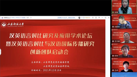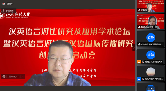 12月18日上午8点20,外国语学院联合社会科学处通过腾讯会议平台在线顺利举行“汉英语言对比研究及应用学术论坛暨汉英语言对比与汉语国际传播研究创新团队”启动仪式。本次论坛特邀华南农业大学黄国文教授、北京外国语大学王文斌教授、北京外国语大学何伟教授、北京语言大学施春宏教授、齐鲁工业大学刘振前教授、山东大学马文教授做主旨发言。山东师范大学社会科学处处长高景海和山东师范大学外国语学院院长、《山东外语教学》主编王卓教授出席开幕式并致辞。山东师范大学外国语学院部分教师,“汉英语言对比与汉语国际传播研究创新团队”全体成员和外国语学院全体研究生共同聆听了本次论坛。开幕式由“汉英语言对比与汉语国际传播研究创新团队”带头人张媛教授主持。