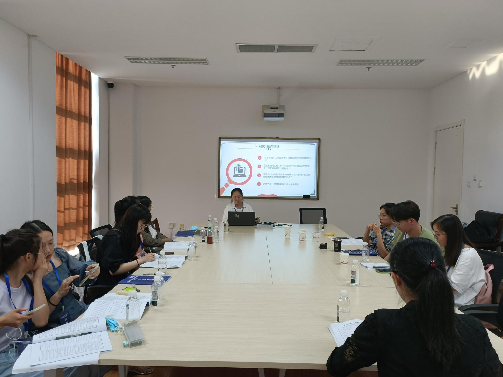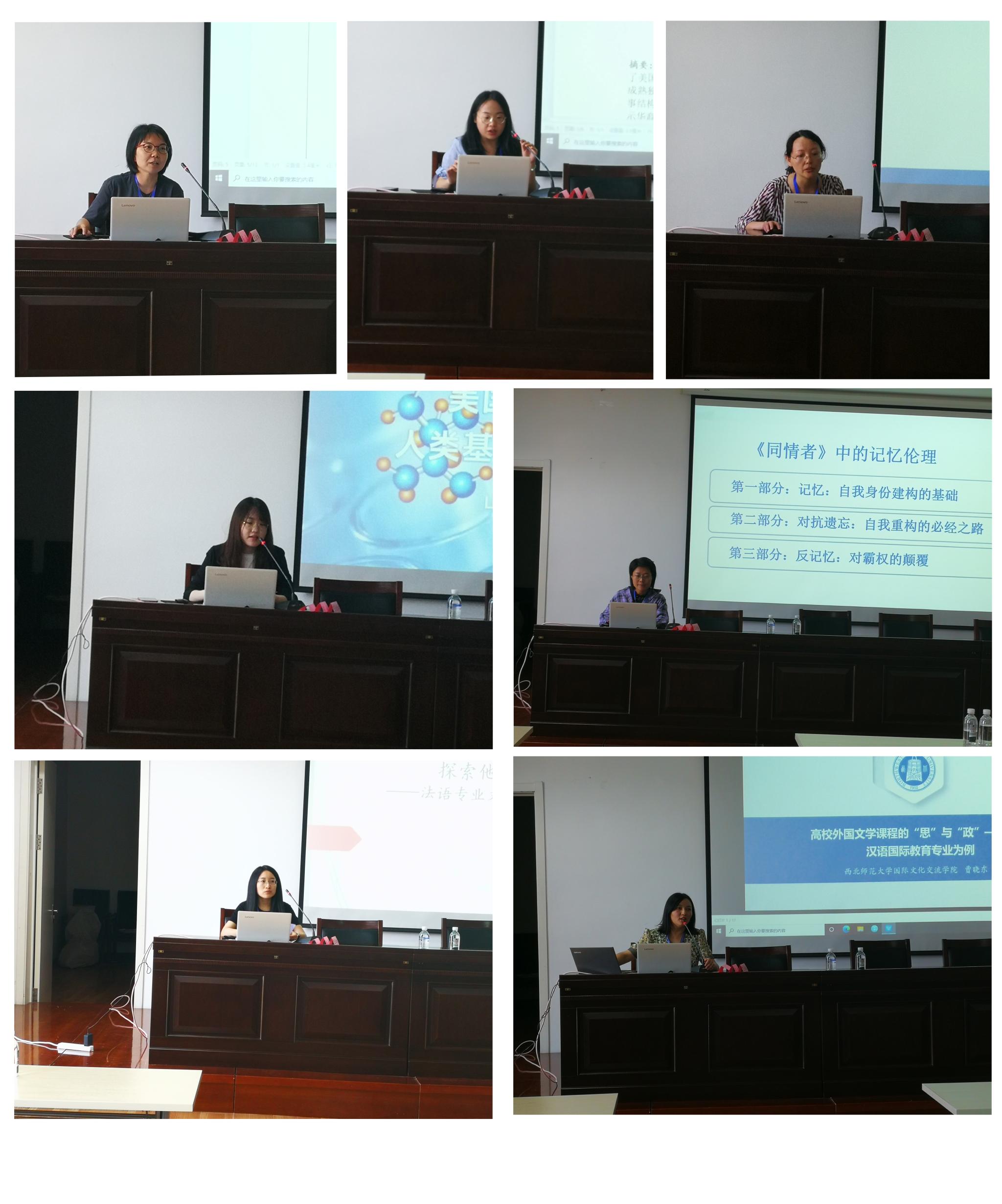 分组讨论分为四组,第一组在图书馆818会议室进行,共7位与会代表进行了发言。第一位发言的是西北师范大学曹晓东,她的报告题目是“人类命运共同体视阈下的外国文学课程思政教学策略探析”,她认为探索高校外国文学课程“课程思政”的价值内蕴和实施路径,应首先立足人类命运共同体的宏阔视野及深层理念,进而结合学情、教情、社情中的实际问题展开教学。第二位发言的是西安外国语大学樊晓燕,她的报告题目是“大学英语生态化整体语言教学模式构建及应用成效分析”,她以教育生态学和整体语言教学法为理论基础,提出了大学英语生态化整体语言教学的构建策略和操作模式,并通过教学实验和问卷调查检验了生态化整体语言教学模式的应用成效。下一位发言的是山东大学高建荣,她的报告题目是“《同情者》中的记忆伦理”,她谈到阮清越借由《同情者》打破了越战以来美国国家话语运用越战记忆对美越个体记忆的操控,并表达了她对美国主流话语中的越战和难民政策进行的重新审视和深入思考。接着,北京外国语大学何辛以“探索他者、构建自我——法语专业文学教学中的跨文化思考”为题,梳理了文学教学在外语教学中的角色演变与发展历程,进而思考跨文化教学法在外语专业文学教学中的可行性与重要性。下一位进行发言的是湖北第二师范学院洪琪,她的报告题目是“基于中国文化视角的英美文学教学改革”,她认为在教学过程中要重新审视英美文学作品,融入中西文化比较、影响和批判等,培养学生批判性思维的同时提高其文化自信、树立正确的三观,成为新时代德才兼备的人才至关重要。下一位进行发言的是山东大学胡晓岩,她的报告题目是“当代美国科幻小说中的人类基因编辑及伦理选择”,围绕人的本质及人类尊严等哲学命题,她认为,文学的审美观和价值表达为何理对待基因技术、规划生命科学发展方向提供了重要警示和启发。最后进行发言的是济宁医学院蒋歌,她的报告题目是“成长小说视角下族裔女性的自我探寻——《喜福会》与《芒果街上的小屋》的比较研究”,通过比较成长阶段中女性身上所展现的异同点,她讲到一方面可以揭示华裔和墨裔女性自我追寻过程中的共同性,另一方面也可以探究多元文化背景下二者构建新身份的过程中所存在的差异性。