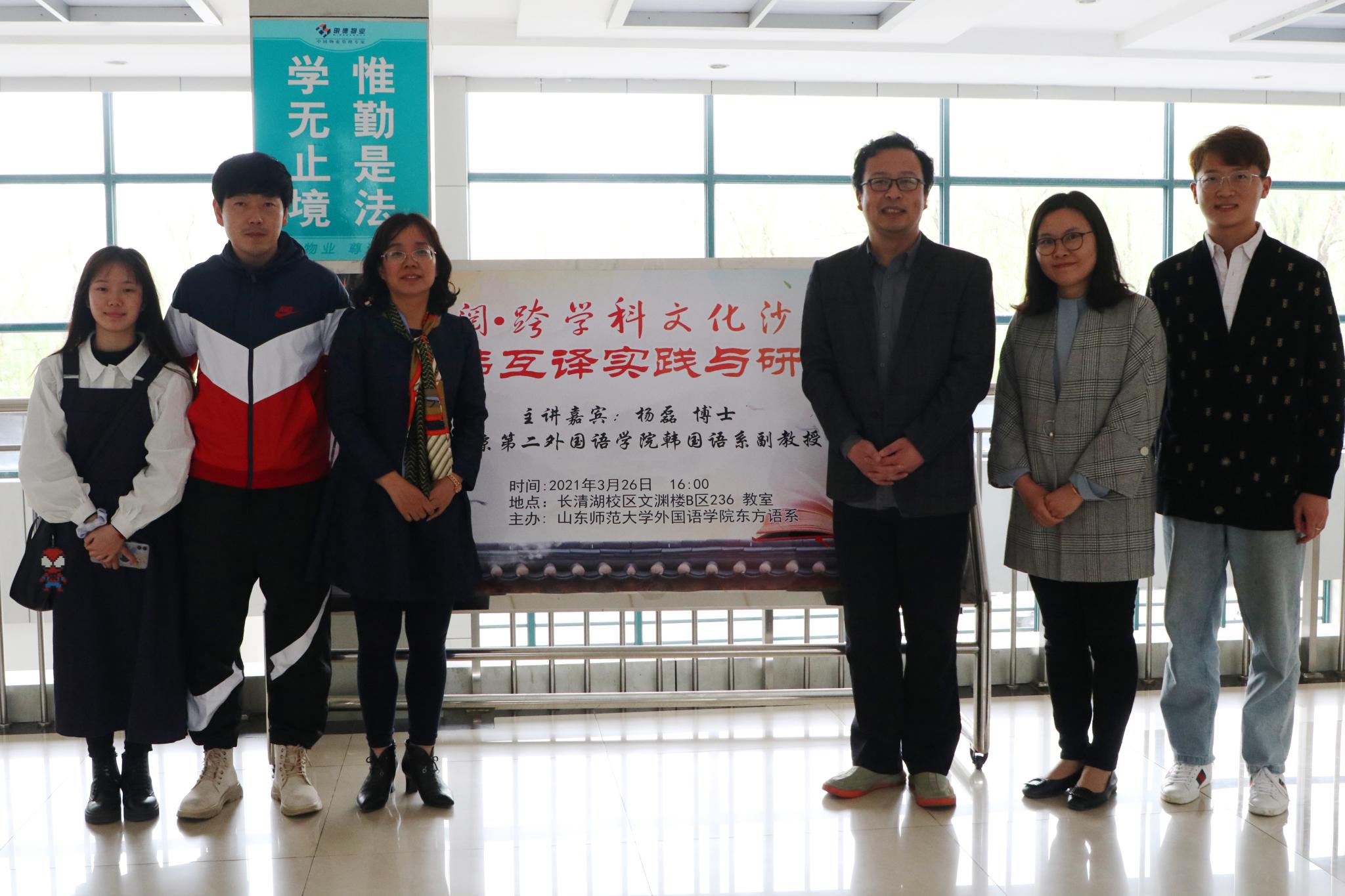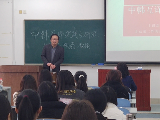 3月26日下午,北京第二外国语学院韩国语系杨磊博士做客山东师范大学外国语学院“雅阅•跨学科文化沙龙”,为外国语学院朝鲜语系师生作了题为《中韩互译实践与研究》的讲座。本次讲座由外国语学院朝鲜语系系主任钟洁老师主持,杨蕾蕾、韩晓、李炳军等老师与朝鲜语系全体本科生聆听了讲座。