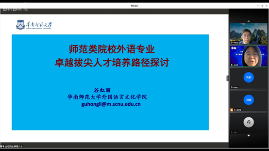 随后,主持人由江西师范大学的李勇忠教授担任,首先进行发言的专家是华南师范大学的谷红丽教授,她的报告题目是“师范类院校外语专业卓越拔尖人才培养路径”。谷教授指出师范类院校外语专业卓越拔尖人才培养需要多元互动融通的培养路径才能达成。这包括正式课程与非正式课程融通、学科专业教育与教师专业教育并存的课程体系、线上线下相协同的混合式教学模式、U-G-S-I多元主体参与的实践育人机制、多维立体的课程思政建设等。她重点探讨了外语卓越人才的培养路径,强调了发展综合外语人才的重要性。