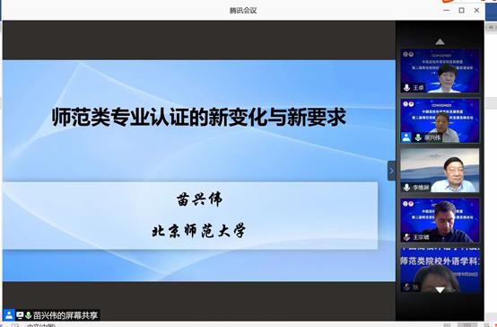 北京师范大学苗兴伟教授的报告主题是“师范类专业认证的新变化与新要求”。苗兴伟教授首先介绍了《普通高等学校师范类专业认证实施办法》,其指导思想是全面贯彻党的教育方针,落实立德树人根本任务,构建中国特色、世界水平的教师教育质量监测认证体系,分级分类开展师范类专业认证,以评促建,以评促改,以评促强,全面保障和提升师范类专业人才培养质量,为培养造就党和人民满意的高素质专业化创新型教师队伍提供有力支撑。其次,苗兴伟教授指出了师范专业认证的基本框架,包括培养目标,毕业要求,课程与教学,合作与实践,师资队伍,支持条件,质量保障等内容。要求有以下几点:回应需求,制定培养目标;以培养目标为依据制定毕业要求;由毕业要求进行课程建设和教学设计;并开展师资队伍建设和教学条件建设;最终指向学生发展,体现产出导向。最后,苗兴伟教授指出了各师范类外语院校应当突出以“三个目标”和“三个支撑”为主线,以“三个达成”为底线的认证逻辑;重查重证,强调“说、做、证”一致;全面覆盖“考查要点”项目,对师范类专业人才培养质量状况做出评判。