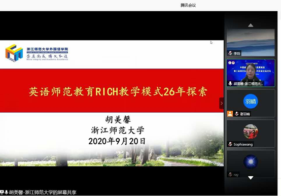最后,会议主持人由北京师范大学的陈则航教授担任。浙江师范大学外国语学院胡美馨教授以“英语师范教育 RICH 教学模式 26 年探索”为题,介绍了浙江师范大学的英语师范教育改革探索实践。RICH 是研究性学习(Research-based learning)、综合性课程(Integrated curriculum)、合作学习(Cooperative learning)、人文素质全面发展(Humanistic outcome)的英文词组首字母缩写。胡教授提出,RICH 通过研究性合作学习、综合性课程,将英语教育与师范教育有机融合,在外语教育中实现全人教育。胡教授以专业基础课程“综合英语”为例,探讨了课程内容培养目标的调整,课程体系的优化对专业建设和学科发展的重要性。