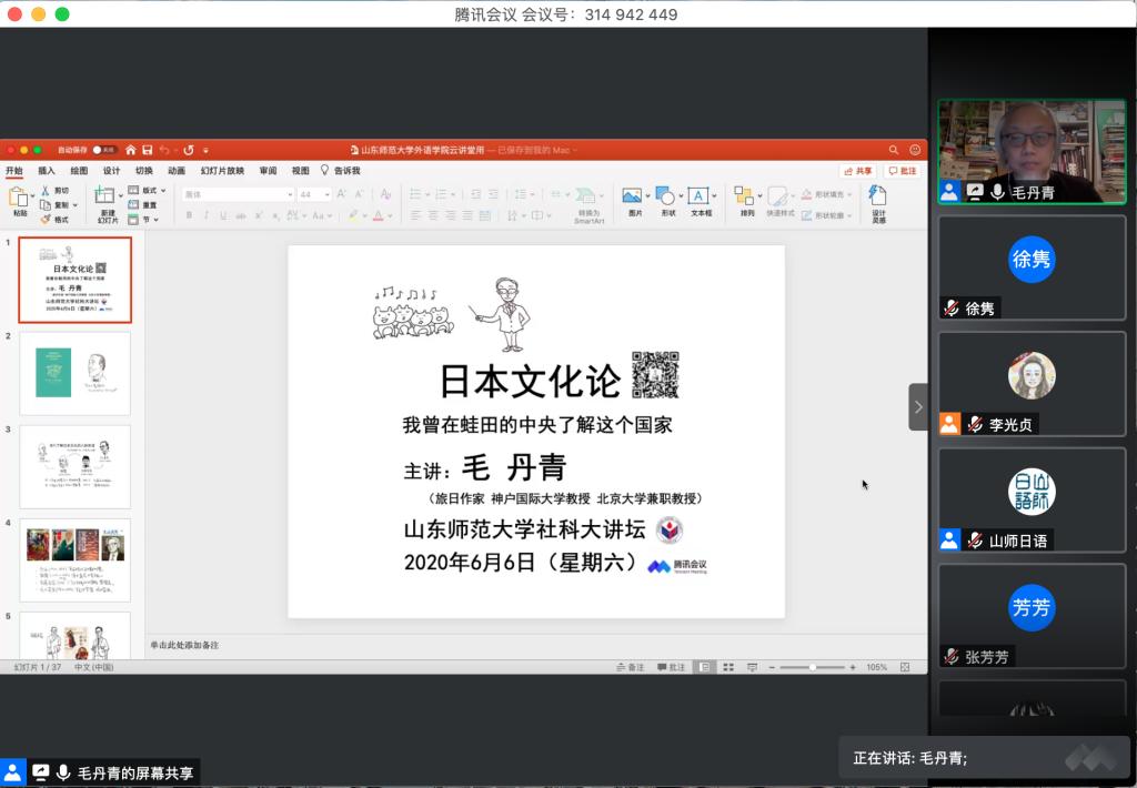 6月6日晚,日本神户国际大学教授、旅日作家、北京大学兼职教授毛丹青做客我校第986期社科大讲坛线上讲座,为我校师生带来以“日本文化论——我曾在蛙田的中央了解这个国家”为主题的学术讲座。本次讲座由外国语学院日语系主任、博士生导师李光贞教授主持,来自外国语学院以及其他院系的师生200余人在线聆听了讲座。