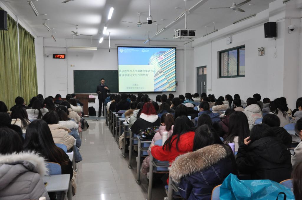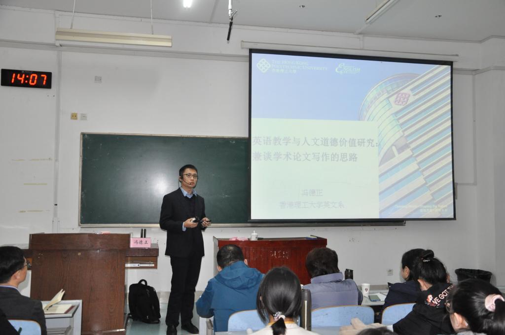 12月23日下午,外国语学院联合社会科学处主办的社科大讲坛第958讲在文渊楼B区236教室成功举办。香港理工大学英文系副教授、博士生导师、香港人文学院青年院士冯德正受邀做客论坛,以“英语教学与人文道德价值研究:兼谈学术论文写作的思路”为题展开讲座。外国语学院部分老师和研究生共同参加了本次讲座,讲座由外国语学院英语系副主任杨彬博士主持。