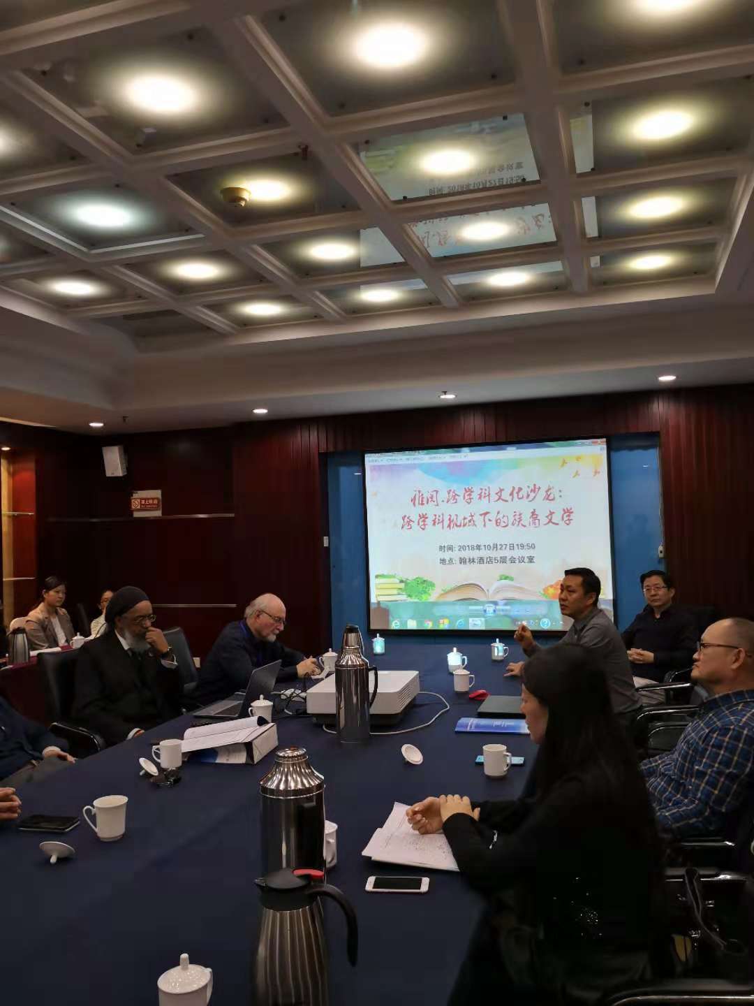10月27日晚,在第五届族裔文学国际研讨会召开期间,“雅阅·跨学科文学沙龙”第五讲在山东师范大学翰林大酒店五层会议厅举行。华中师范大学罗良功教授、中国人民大学郭英剑教授、陈世丹教授、上海师范大学朱振武教授、厦门大学张龙海教授、中央民族大学朱小琳教授、美国马萨诸塞大学沙巴兹教授、北伊利诺伊大学威廉·贝克教授、韩国东国大学金英敏教授等专家学者围绕着“跨学科视域下的族裔文学”这一主题进行了座谈,50余名学者参与了座谈。座谈由山东师范大学外国语学院院长、《山东外语教学》主编王卓教授主持。