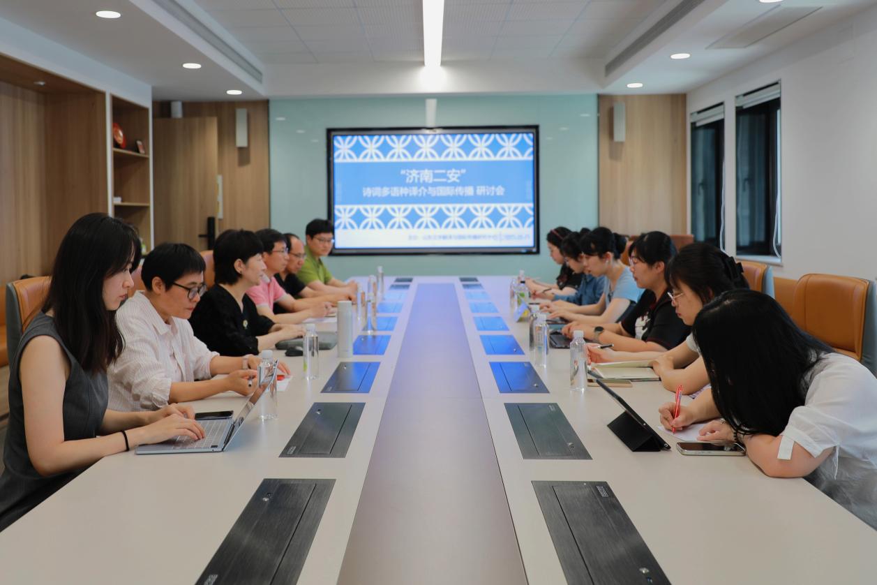 6月25日下午,山东文学翻译与国际传播研究中心在文渊楼A座413会议室围绕“济南二安”诗词多语种译介与国际传播召开研讨会。中心主任杨彬副教授主持会议,外国语学院院长王卓教授莅临指导,学院英、俄、日、韩、阿、西、法、葡各语种教师代表参与了研讨。