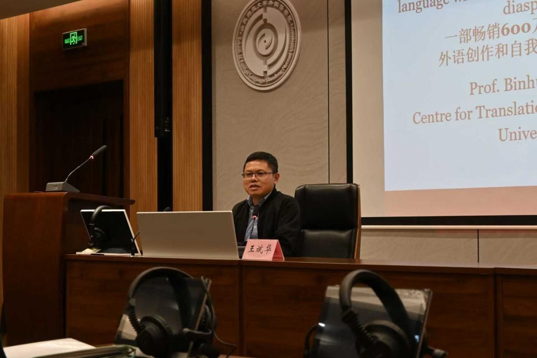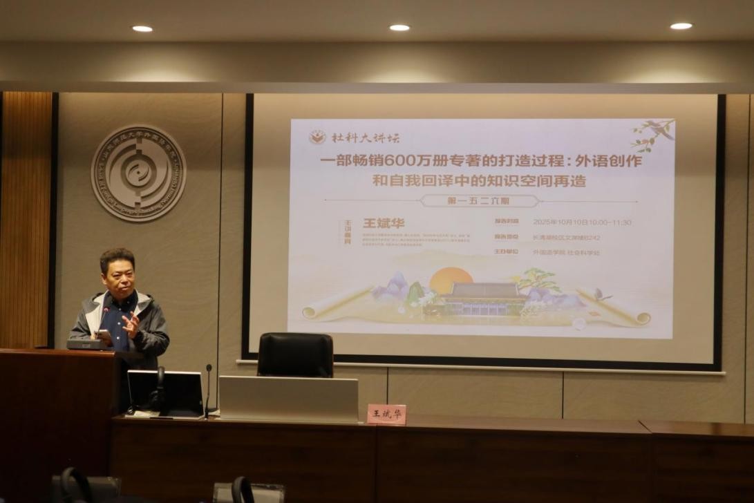 2025年10月10日,世界百强大学英国利兹大学终身讲席教授、欧洲科学与艺术院院士王斌华教授做客我校第1526期社科大讲坛,发表了题为“一部畅销600万册专著的打造过程:外语创作和自我回译中的知识空间再造”的学术报告。王斌华教授以历史学家黄仁宇的名著《万历十五年》为核心案例,结合档案研究与语料库分析,深入剖析了该著作如何通过“自我回译”等策略,跨越语言与文化的壁垒,最终实现知识空间的再造与学术范式的创新。本次讲座由外国语学院与社会科学处联合举办,由徐彬教授主持,杨彬老师、刘焱老师、崔佳老师、赵金曼老师以及众多研究生共同参加了此次学术活动。