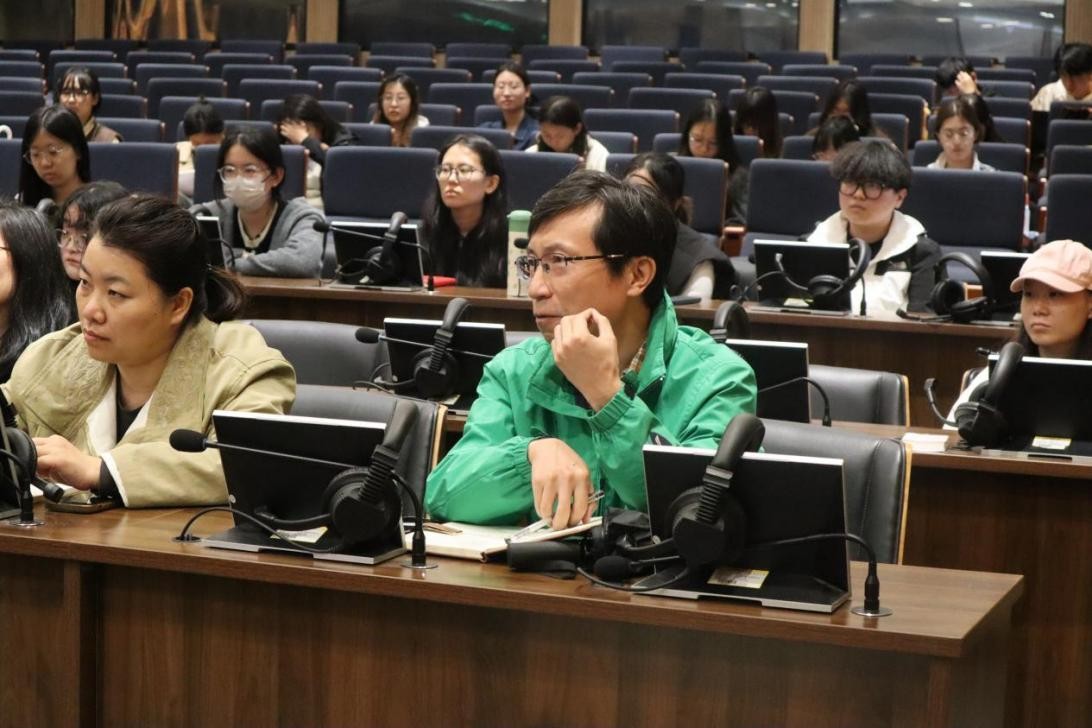 在互动环节,现场师生与王斌华教授进行了深入的学术交流。英语系杨彬副教授就业界普遍关注的中国文学典籍外译问题与王教授交换了看法。王教授结合自身的翻译实践与教学经验,分享了处理文化负载词与历史语境的策略,为在场的师生带来了新的研究启发。刘焱老师则就研究中的数据整理与语料库文本分析技术提出了具体问题,王教授结合“知行合一”的理念与当前的技术发展,介绍了前沿的研究方法。