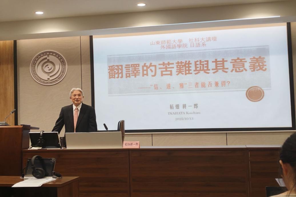 2025年10月13日,外国语学院联合社会科学处在长清湖校区文渊楼B242举办了第1528期社科大讲坛,主题为“翻译的苦难与其意义——‘信、达、雅’三者能否兼得?”。本次讲座特邀日本早稻田大学名誉教授稻畑耕一郎教授担任主讲嘉宾,由外国语学院日语系主任崔颖副教授主持,外国语学院翻译硕士学位点负责人徐彬教授、日语系赵琳博士、吕晶博士、郭睿麒博士等教师及研究生、高年级本科生一同出席。