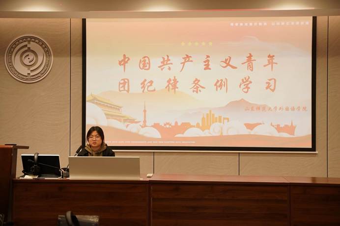 为帮外院团员守住思想底线、明确行动准则,让践行使命的每一步都走得端正,近日,外国语学院团校面向2024级入团积极分子和发展团员,在文渊楼B座242报告厅举办“星火”系列团课第十一期第六次培训,由秘书处工作人员兼团校办公室组织部部长景昕淼进行了主题为“团的纪律的建设和具体内容”的学习会。
