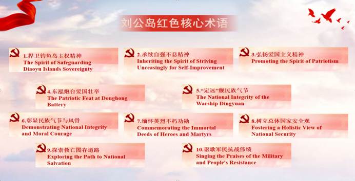 在刘公岛,实践团队参观了甲午战争陈列馆和“定远”号纪念舰,观看了历史图片和实物展陈,深刻体悟到甲午战争留给中华民族的历史警醒,并在总体国家安全观教育展馆开展研学活动。团队结合外语专业特点,整理形成了《刘公岛红色核心术语双语对照表》,收录百余条术语。