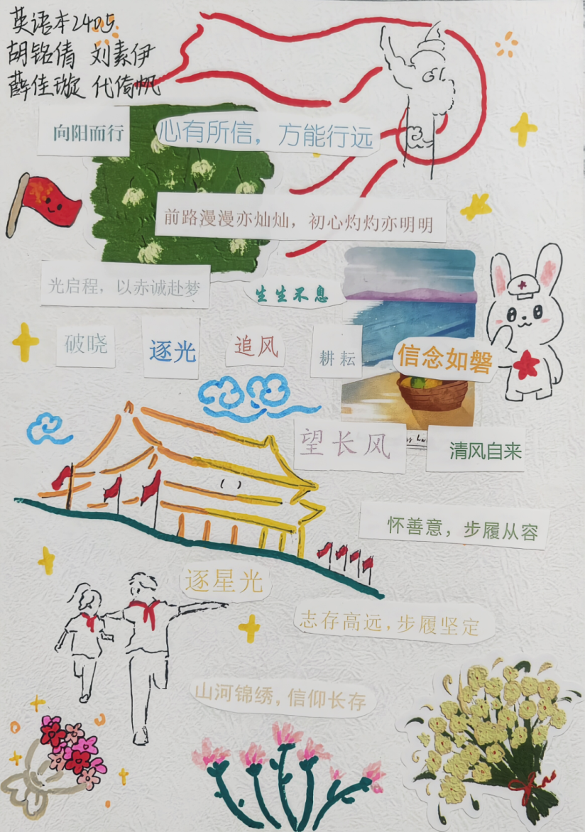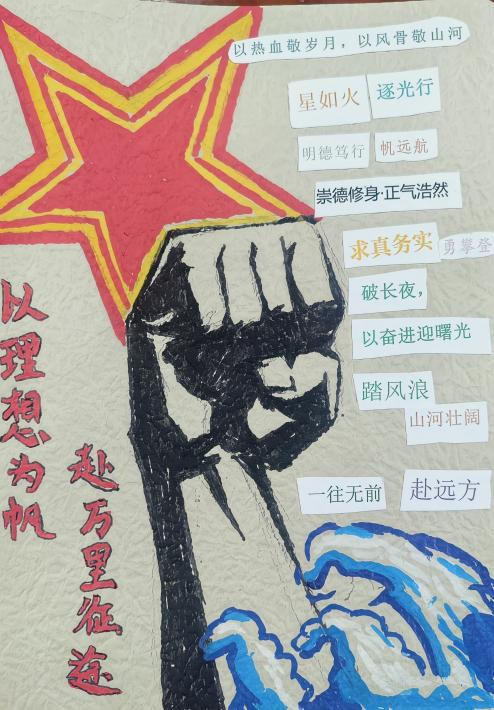 随后,同学们以小组为单位,围绕“致敬先烈,青春向党,薪火相传”的核心主题进行拼贴诗的创作。过程中,同学们用手绘的方式画出心中的“红色印象”,再将字词连成自己的青春格言,用一笔一划传达敬意,用一字一句表达志向。